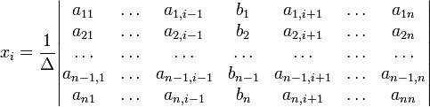 (i-ый столбец матрицы системы заменяется столбцом свободных членов). В другой форме правило Крамера формулируется так: для любых коэффициентов c1, c2, …, cn справедливо равенство:
