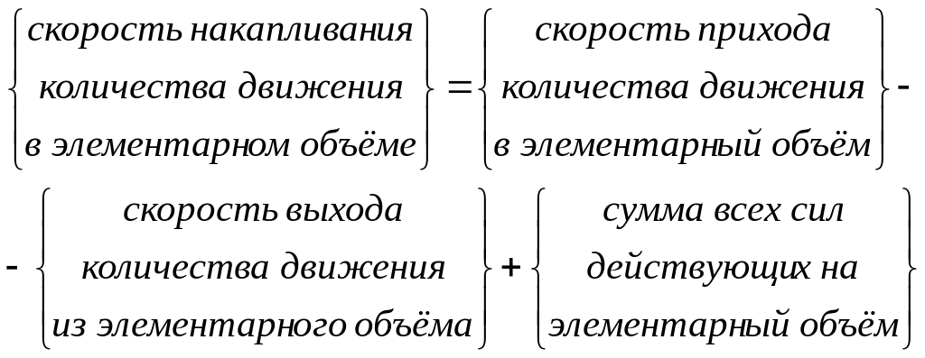 Закон сохранения количества движения – изменение количества движения в элементе объёма жидкости (dx, dy, dz) равно результирующей всех внешних сил, приложенных к поверхности и объёму элемента.