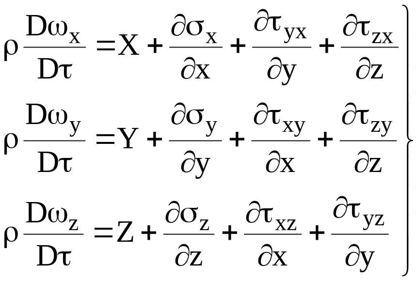 Закон сохранения количества движения можно представить в векторной форме или в форме трёх скалярных уравнений. При выводе уравнения движения учитываем поверхностные силы на трёх из шести граней объёма. На каждой грани для описания полной силы, действующей на эту грань, достаточно одного нормального и двух касательных напряжений. Силы, обусловленные электрической природой, гравитацией и магнетизмом и их проекции на оси обозначаем через Х, Y, Z. Три нормальных напряжения x, y, z обусловлены давлением и трением при растяжении элементов. Шесть касательных напряжений обусловлены степенью сдвига, и только три касательных напряжения независимы. Касательные напряжения с одинаковыми, но расположенными в разном порядке индексами равны: