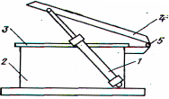 Храповое колесо жесткозакр-ное на оси 5 ротора, повор-ся от усилия, созд-го штоком осн-го качающегося цилиндра 1. Шток этого цилиндра заканч-ся роликом 3. При подаче раб. жидкости или сжатого воздуха в поршневую полость цилиндра 1 его шток подходит к храповому колесу, входит в один из его пазов и повор-ет ротор. Положение ротора фиксируется с помощью фиксатора, а шток цилиндра 1 отводится назад. Цилиндр 2 предн-н для поджатия ролика 3 к пазу храпового колеса и для возвр-я цилиндра 1 в исх. полож-е. Для упр-я работой цилиндров служит с-ма кон-х выкл-лей.