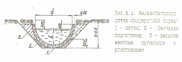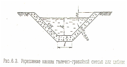 Нормальная работа водоотводных канав на марях зависит от надёжности их укрепления и дна. Тип укрепления принимается в зависимости от скорости течения воды. Так, канвы в мягкопластичных суглинках и супесях при скоростях до 1 м/с можно укреплять обсыпкой галечно-гравийной смесью или щебнем толщиной слоя до 0,3 м в зависимости от размеров частиц используемого материала (рис. 6.3).
