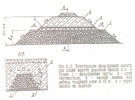 При высоте дорожной насыпи до 3 м фильтрующую насыпь следует отсыпать до её верха (рис.6.1), при высоте дорожной насыпи более 3 м высота фильтрующей насыпи определяется расчётом (рис. 6.2). Для фильтрующей насыпи используется чистый, без примеси мелкозёма, морозоустойчивый камень размером не более 40 см.