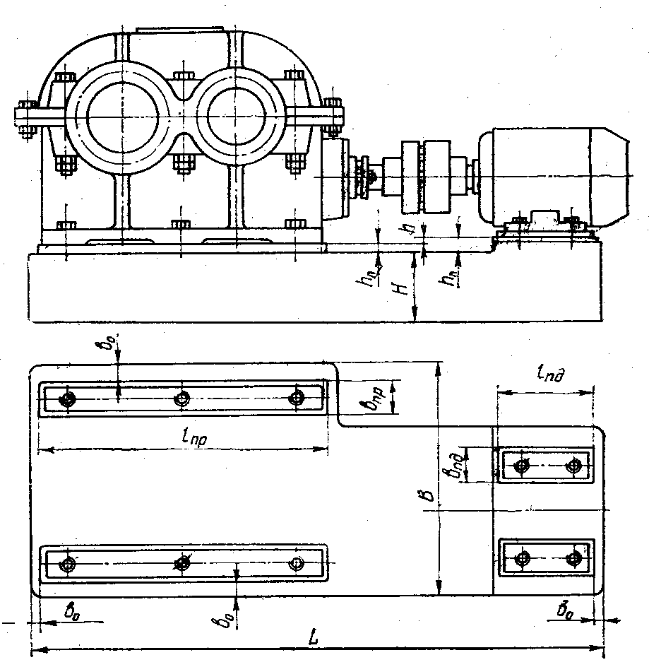 17.1. Довжину L та ширину плити B уточнюють за накресленим контуром привода. Висоту плити H визначають із умов достатньої жорсткості: H = (0,09...0,11)·L, де L – довжина плити (для Т і Г-подібної форми розгорнута довжина). Знайдені розміри L, B, H приводять до лінійних нормальних розмірів за ГОСТ 6636 – 69.
