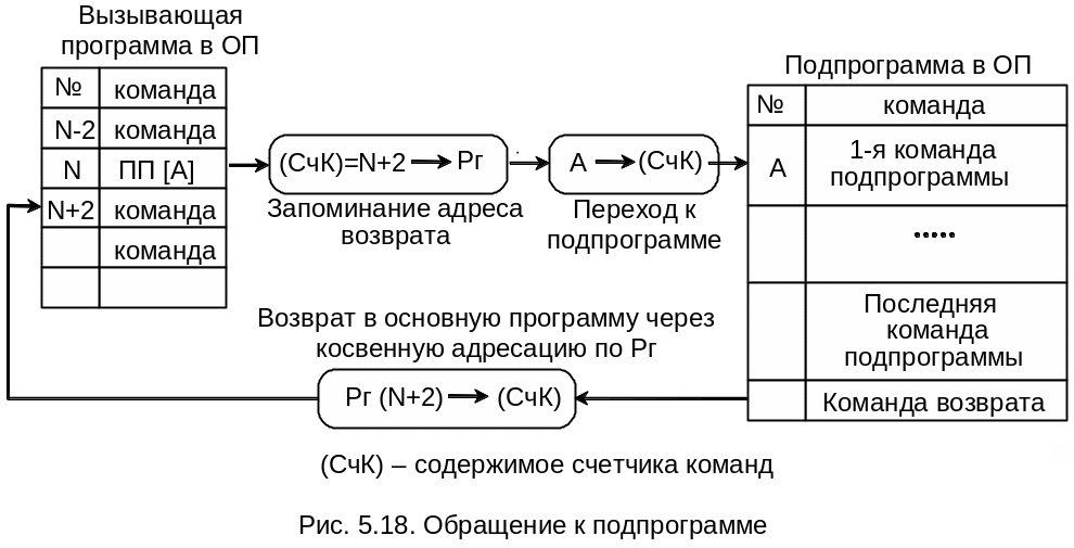 Перед выполнением команды ПП формируется адрес возврата (Авозвр), т.е. (СчК) = (СчК) + L (в данном случае это адрес N+2). Затем Авозвр запоминается в ячейке памяти (регистре), адрес которой (которого) в явной или неявной форме указан в команде ПП. Затем в СчК заносится содержимое адресного поля команды ПП, т.е. адрес начала подпрограммы (А). В конце подпрограммы размещается команда возврата, которая фактически является командой БПК (безусловный косвенный переход), и указывает путем косвенной адресации (через ячейку ОП или регистр) адрес ячейки ОП, куда надо возвратиться для дальнейшего выполнения основной программы. В данном случае косвенная адресация осуществляется через регистр Рг.