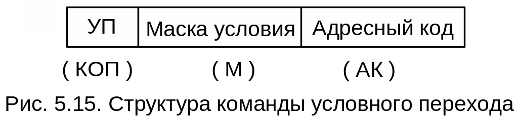 Условия перехода задаются либо самим кодом операции УП, либо в виде отдельного поля команды – маски условия (кода условия). В последнем случае общий формат команды УП имеет вид, показанный на рис. 5.15.