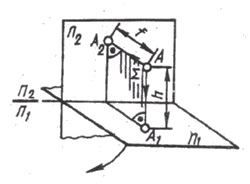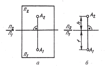 Две связанные между собой ортогональные проекции точки однозначно определяют ее положение относительно плоскостей проекций. Если определить положение точки А относительно этих плоскостей (рис. 61, б) ее высотой h (АА1=h) и глубиной f(AA2 =f), то эти величины на комплексном чертеже существуют как отрезки вертикальной линии связи. Это обстоятельство позволяет легко реконструировать чертеж, т. е. определить по чертежу положение точки относительно плоскостей проекций. Для этого достаточно в точке А2 чертежа восстановить перпендикуляр к плоскости чертежа (считая ее фронтальной) длиной, равной глубине f. Конец этого перпендикуляра определит положение точки Аотносительно плоскости чертежа.