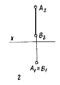 На рис. 69, а показаны прямая l и принадлежащие ей точки А и В. Для построения фронтальной проекции прямой l2 достаточно построить фронтальные проекции точек А2 и В2 и соединить их прямой. Аналогично строится горизонтальная проекция, проходящая через горизонтальные проекции точек А1 иВ1. После совмещения плоскости П1 с плоскостью П2 получим двухпроекционный комплексный чертеж прямой l (рис. 69, б).