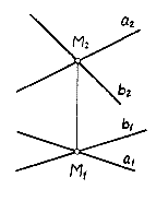 Если прямые скрещиваются,то их одноименные проекции могут пересекаться (рис.2.6-а) или на одной проекции пересекаться, а на второй - быть параллельными (рис.2.6-б). В первом случае точки пересечения их одноименных проекций не должны лежать на одной линии связи. Из рис.2.6-а видно, что фронтальные проекции B2 D2 являются точкой пересечения фронтальных проекций прямых m и n, а горизонтальные проекции A1 C1 - точкой пересечения горизонтальных проекций этих прямых. Но так как точки пересечения одноименных проекций не лежат на одной линии связи, ни одна из точек A, B, C, D не является общим элементом двух прямых и, следовательно, прямые тип скрещиваются. То же самое можно сказать и относительно прямых а и b (рис.2.6-б).