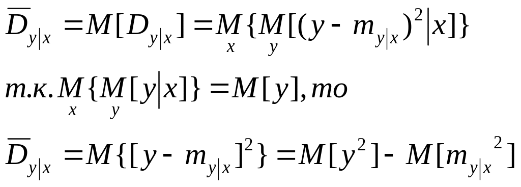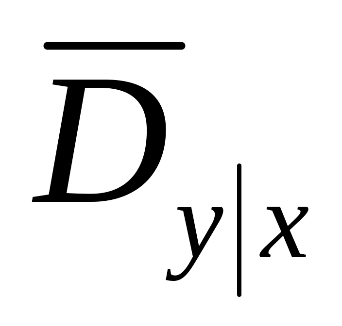 Т.е. полная дисперсия является суммой средней условной дисперсии и дисперсии условного математического ожидания. Поясним это. Если х – входная, а у – выходная переменные, то дисперсия условного мат. ожидания D{M[ylx]} представляет собой ту часть полной дисперсии Dy выходной переменной у, которая связана с влиянием входной переменной х. Вторая часть полной дисперсии – средняя условная дисперсия – определяется влиянием совокупности всех остальных переменных, кроме учтенной переменной х. Так как = Dy – D{M[ylx]} , то ≤Dy Равенство имеет место, когда D{M[ylx]} = 0 В качестве меры корреляц. отношения принято η2yx=1 - / Dy ; ηyx – корреляц. отношение