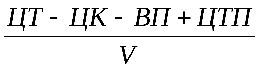 де М – кількість грошових одиниць, необхідних у визначений період для обігу; ЦТ – сума цін товарів, що призначені для реалізації за визначений період часу; ЦК – сума цін товарів, проданих у кредит за визначений період часу; ЦТП – сума цін проданих у кредит товарів, терміни оплати за які наступили у звітному періоді; ВП – сума цін товарів, платежі за які взаємопогашаються (бартер, взаємозаліки тощо).