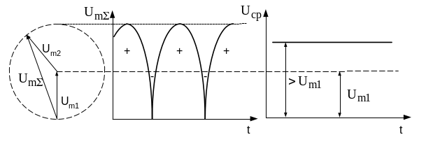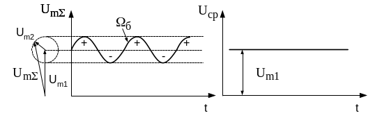 Если амплитуды сигналов примерно равны (рис.7.26), то площадь положительных полуволн будет превосходить площадь отрицательных полуволн, а среднее значение выходного напряжения будет превышать амплитуду вектора .