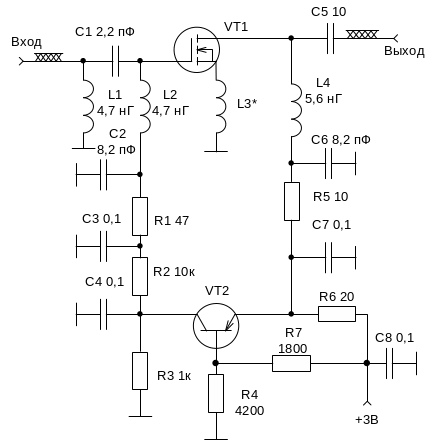 Катушки индуктивности L3 (в цепи каждого вывода истока) - короткие линии передачи между каждым истоком и землей, действующие как элементы последовательной ООС.