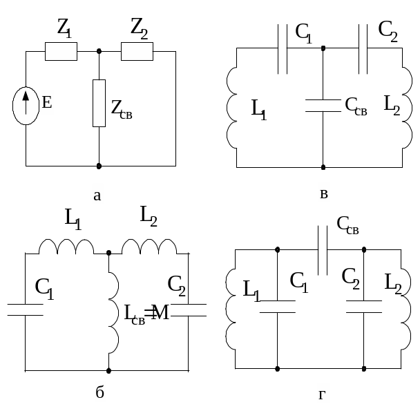 Рис.5.27. Обобщенная эквивалентная схема двух связанных контуров (а), контуры с индуктивной (б), внутриемкостной (в) и внешнеемкостной (г) связями