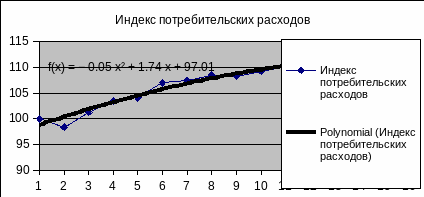 На рис. 2.9 приведен результат построения тренда и прогнозирования по тренду У = 97.008 + 1.739t - 0.0488t2 для временного ряда Индекс потребительских расходов. В качестве аппроксимирующей функции выбран полином второй степени - парабола, по которой построен прогноз на два шага вперед.