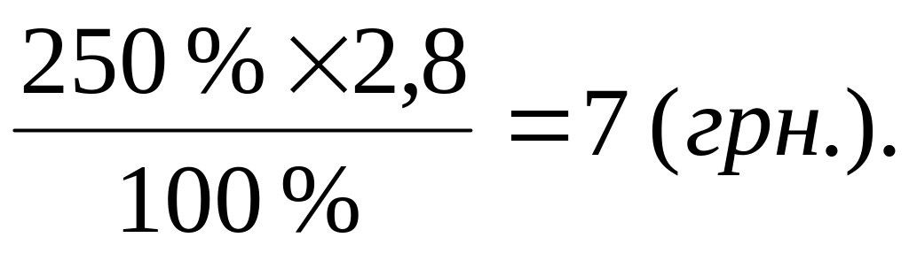 Приклад 8. Визначити виробничу собівартість виробу, якщо відомо, що вага заготовки – 12,5 кг, чиста маса – 8,8 кг. Ціна матеріалу за 1 тонну 120 тис. грн., ціна 1 тонни відходів – 7 тис. грн. Основна заробітна плата виробничих робітників становить 80 грн. ЦВ = 180 %, витрати на експлуатацію та утримання обладнання – 240 %, загальногосподарські витрати – 140 %. Відрахування соцстраху – 37,5 %. Додаткова заробітна плата – 12 % від основної.