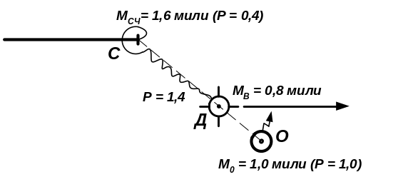 Из примера на рис. 10 очевидно, что вероятнейшее место (точка Д) точнее (МВ = 0,8 мили) и обсервованного (МО = 1,0 мили) и счислимого (МСЧ = 1,6 мили) мест.