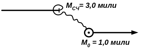 4. Если радиальная (круговая) СКП обсервованного места М0 в три и более раза выше (точнее) радиальной (круговой) СКП счислимого места МСЧ на момент обсервации, то к дальнейшему счислению принимают «чисто» координаты обсервованного места и не отыскивают вероятнейшее место осреднением со счислимым местом (рис. 9).