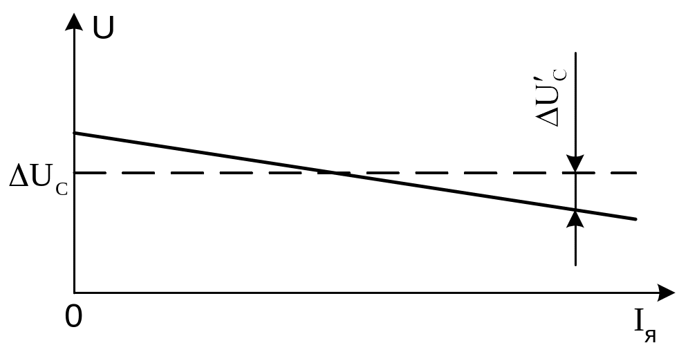 Рис. 1.6. Зовнішня характеристика генератора з урахуванням впливу стабілізуючого опору вугільного регулятора напруження.