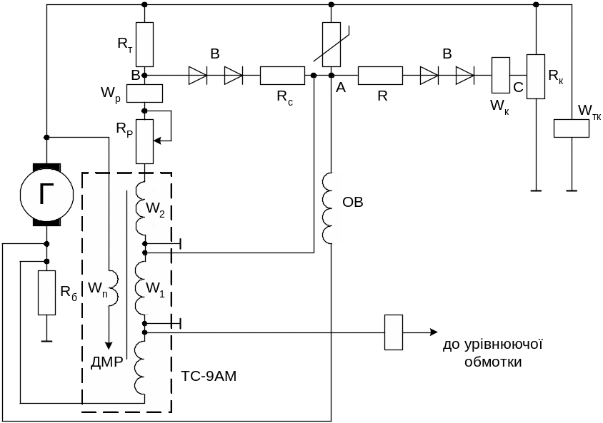 На рис. 1.7 приведена електрична схема регулятора РУГ-82 зі стабілізуючим трансформатором ТС-9АМ-12. На сердечнику трансформатора розташовані чотири обмотки: первинна послідовна Wn, первинна паралельна Wі, обмотка урівнюючого ланцюга Wy і повторна Wz.