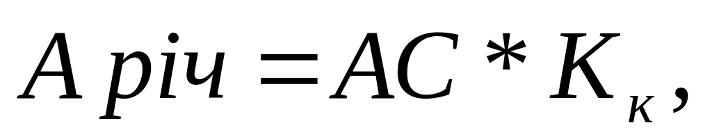 При кумулятивному методі нарахування амортизації річна сума амортизації (Аріч) визначається як помноження вартості (АС), що амортизується, і кумулятивного коефіцієнта (Кк):