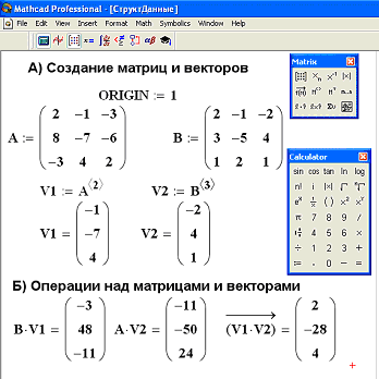 А) Создать вектор V1 из второго столбца матрицы А и вектор V2 из третьего столбца матрицы В.