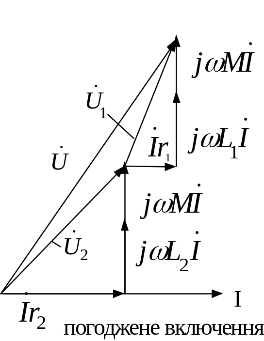 Нехай два споживача електричної енергії мають опори r1 і r2 , індуктивності L1 і L2 , а також взаємоіндуктивність М, з’єднані послідовно. Можливі два випадки їх включення: погоджене та зустрічне.