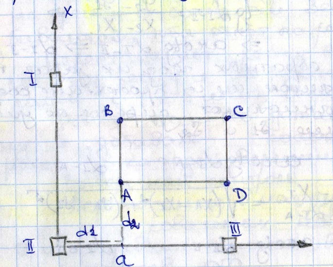 Известны координаты пунктов сетки xI, yI, xII, yII, xIII, yIII и проектные координаты т. А – xА, yА. Требуется вынести на местность от пунктов строительной сетки т. А. Для этого необходимо вычислить d1 и d2: