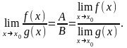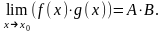 Доказательство. Представим f(x)=A+α(x), g(x)=B+β(x), где α(х) и β(х) – бесконечно малые при х→х0. Тогда f(x)·g(x)=AB+Aβ(x)+Bα(x)+α(x)β(x). Но Aβ(x)+Bα(x)+α(x)β(x) – бесконечно малая (так как f(x) и g(x) ограничены в окрестности х0), следовательно,