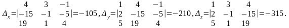 , решенную в предыдущем разделе методом Гаусса, и применим к ней правило Крамера. Найдем все нужные определители: