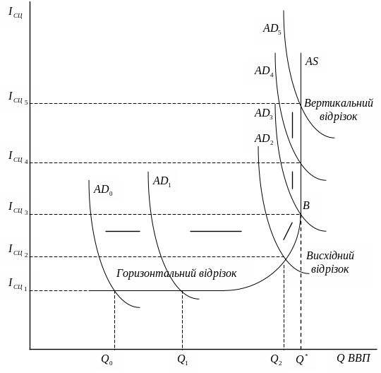 горизонтальному відрізку кривої AD-AS (фаза депресії) не містить у собі інфляційної небезпеки. І тому стимулювання AD є завжди бажаним, оскільки воно зумовлює зростання реальних обсягів виробництва і приріст доходу.