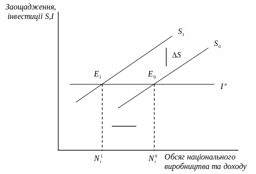 домогосподарства заощаджують однакову суму, але заощадження знецінюються, оскільки зростання схильності до заощаджень зумовлює зменшення схильності до споживання. Ця обставина робить