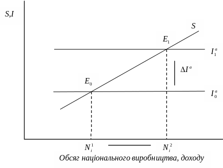 Рис.8.7 Вплив обсягу автономних інвестицій на зміну національного виробництва та доходу