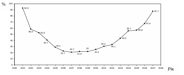 Робоча сила в Україні дійсно кваліфікована і дешева, але ринок праці не досить гнучкий і не встигає за розвитком економіки. Фактор дешевої робочої сили завдає шкоди розвиткові національної економіки. Річний обсяг іноземних інвестицій в розрахунку на людину складає лише 372 дол., що у 6 разів менше за відповідний показник сусідньої Польщі. Не стимулюючи інвестиції, Україна таким чином відмовляється від великих можливостей модернізації власного господарства. За темпами інвестування ми ще не досягли рівня 1990р.(рис.8.14)