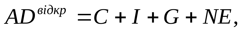 У відкритій економіці сукупний попит визначається як загальний обсяг вітчизняних товарів, попит на які за певного рівня цін виявлять як вітчизняні, так і закордонні покупці. Структура сукупного попиту у відкритій економіці відображається рівнянням: