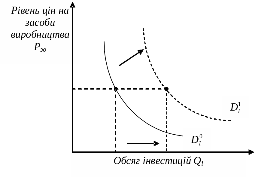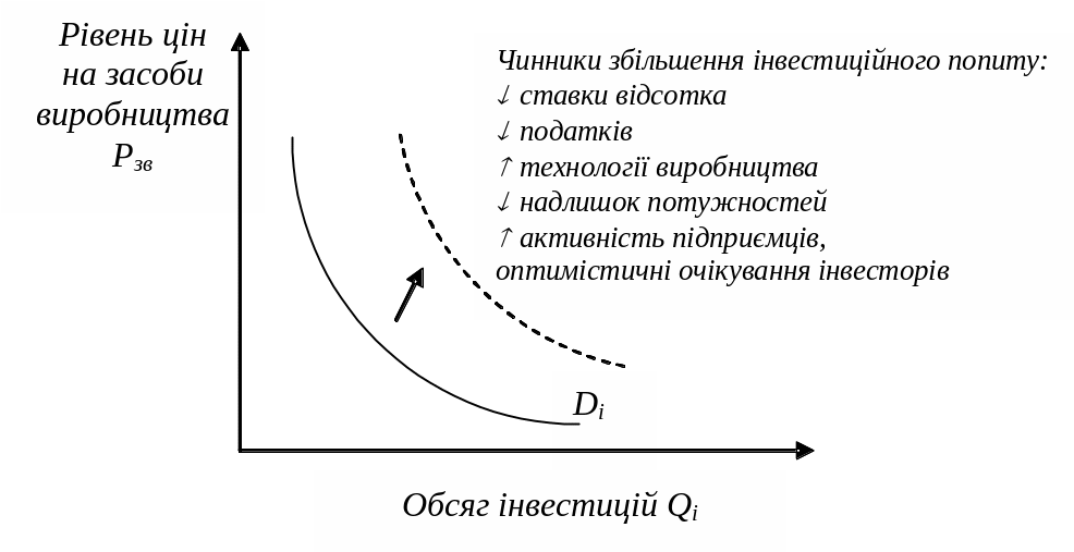 Розглянемо другий структурний елемент сукупного попиту – інвестиційний попит (Di). Інвестиційні витрати пов’язані зі збільшенням реального капіталу (засобів виробництва). Отже, інвестиційний попит залежить від рівня цін на засоби виробництва.