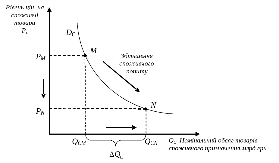 Якщо ж ціни зростатимуть від точки N до точки M, то споживчий попит зміститься ліворуч (від точки QCN до точки QCM ) і означатиме зменшення його обсягу на величину ΔQC. Причиною зменшення споживчого попиту буде скорочення реальної грошової маси на руках у домогосподарств (реальних грошових залишків). Це означає, що вони зможуть при вищому рівні цін придбати менше товарів споживчого призначення. Зниження рівня купівельної спроможності населення внаслідок зменшення реальних грошових залишків називається ефектом реальних залишків, або ефектом багатства. Цей ефект пояснює відємний нахил кривої споживчого попиту.