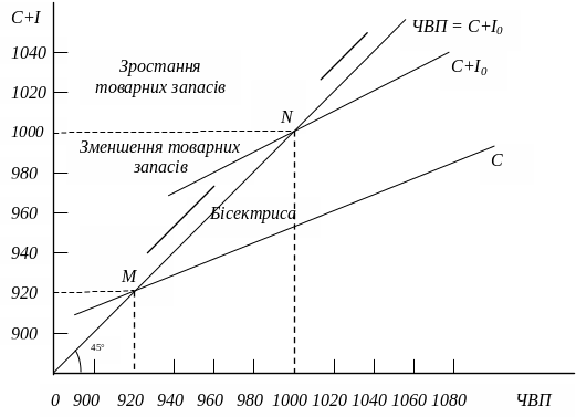 На графіку бісектриса показує, що кожна точка на ній відповідає рівновазі між обсягом ЧВП та сукупними витратами (C+I0). Лінію сукупних витрат представляють функції споживання (C) і запланованих інвестицій (I0).