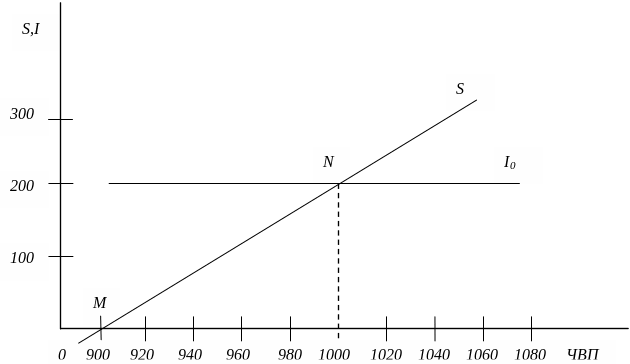 Крива заощаджень проходить через точку М, якій відповідає 900 млрд грн ЧВП і нульовий рівень заощаджень: за цієї умови весь ЧВП споживається і зовсім не заощаджується, та точку N прямої за планових інвестицій, якій відповідає рівноважний обсяг ЧВП (1000 млрд грн). Точка N – характеризує рівновагу витрат (C + I0) та ЧВП: коли обсяг заощаджень, що вилучається із споживання домогосподарствами, збігається з бажаннями інвесторів інвестувати саме такий обсяг.