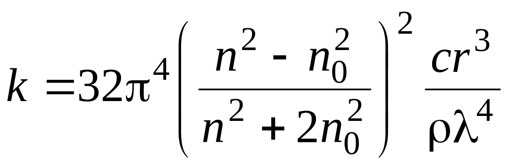 Рівняння (4.9) застосовують для безбарвних розведених золів з радіусом часток (r або rекв), меншим за 0,1. Відношення k = І/І0 називається відносним світлорозсіянням системи. Якщо відома масова концентрація золю с (кг/м3) та радіус сферичних часток r (м), а також густина дисперсної фази (кг/м3), рівняння Релея має такий вигляд: