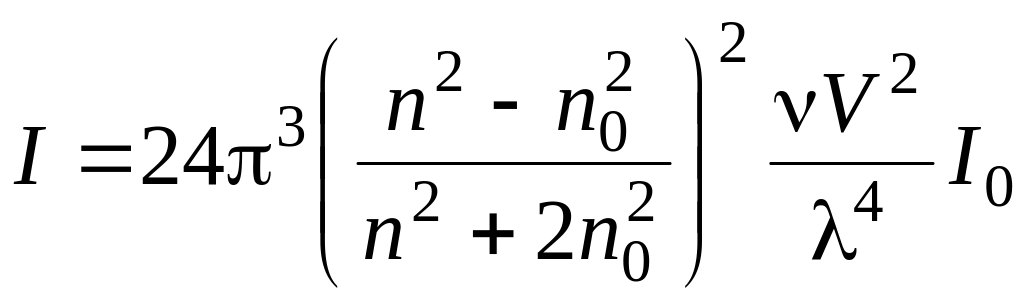 де І та І0 – інтенсивність відповідно розсіяного і падаючого світла; n та n0 – показники заломлення відповідно для дисперсної фази і дисперсійного середовища; – частинна концентрація золю (кількість часток/м3); V – об’єм частки дисперсної фази (м3); – довжина хвилі світла (м).