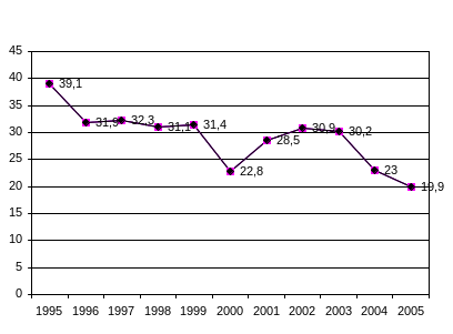 Рис. 2.1. Планова частина доходов місцевих бюджетів в структурі доходів Зведеного бюджету за 1995-2005 роки.