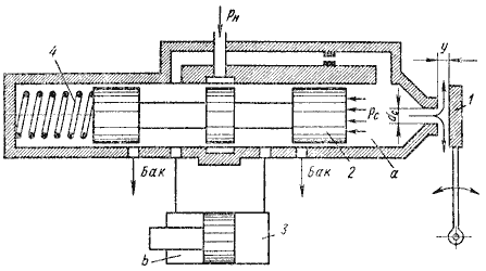 Для повышения чувствительности усилителя и обеспечения одновременно увеличения мощности выходного сигнала применяют двухкаскадные устройства, первой ступенью усиления которых является обычно усилитель типа сопло- заслонка, а второй - золотник. Принципиальная схема такого устройства показана на рис.8.6. Междроссельная камера a этой схемы соединена с правой полостью основного распределительного золотника, плунжер 2 которого находится в равновесии под действием усилия пружины 4 и давления жидкости в этой камере. Жидкость постоянно подводится в штоковую полость b силового цилиндра, поршень которого при одновременной подаче жидкости в противоположную полость перемещается вследствие разности площадей поршня влево, и при соединении этой полости с баком - в правую сторону.