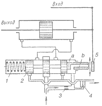 Рис.8.7. Двухступенчатая следящая система с обратной связью по давлению: 1 - пружина; 2 - плунжер; 3 - дроссель; 4 - клапан; 5 - заслонка