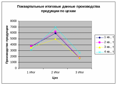 кварталам. (Рис. 6)По итоговой таблице построите круговую диаграмму производства продукции за год по цехам 1,2 и 3. (Рис. 7)