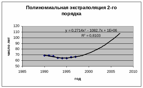 Прогнозирование будем проводить по средним значениям продолжительности жизни всего населения. Построим по экспериментальным точкам диаграмму (рис. 1). Далее подберем функцию, которая наиболее точно описывает изменения изучаемого процесса и может быть использована для прогнозирования изучаемого процесса в последующие годы.
