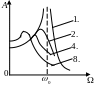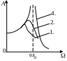 На рисунке под номером 1 приведен график зависимости амплитуды A колебаний от частоты Ω вынуждающей силы.