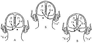 Модель слуховой асимметрии у нормальных людей, предложенная Д.Кимура (цит. по С.Спрингер и Г.Дейч, 1983). А. При монауральном предъявлении стимула на левое ухо информация передается к правому полушарию по контрлатеральным путям и к левому полушарию по ипсилатеральным путям. Испытуемый правильно называет слог ('ба'). Б. При монауральном предъявлении стимула на правое ухо информация посылается к левому полушарию по контрлатеральным путям и к правому полушарию по ипсилатеральным путям. Испытуемый правильно называет слог ('га'). В. При дихотическом предъявлении передача в ипсилатеральных путях подавлена, поэтому 'га' поступает только к левому (речевому) полушарию. Слог 'ба' достигает левого (речевого) полушария только через комиссуры. Вследствие этого слог 'га' идентифицируется обычно более точно, чем 'ба' (преимущество правого уха). |