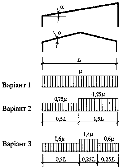 Коефіцієнт слід приймати для прольотів з ліхтарем відповідно до варіантів 1 і 2 схеми 3, для прольотів без ліхтаря – з варіантами 1 і 2 схем 5 і 6.