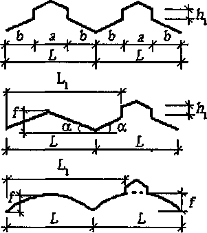 Значення b (b1, b2) і т слід визначати згідно з вказівками до схеми 8; проліт L приймається таким, що дорівнює відстані між верхніми кромками ліхтарів.