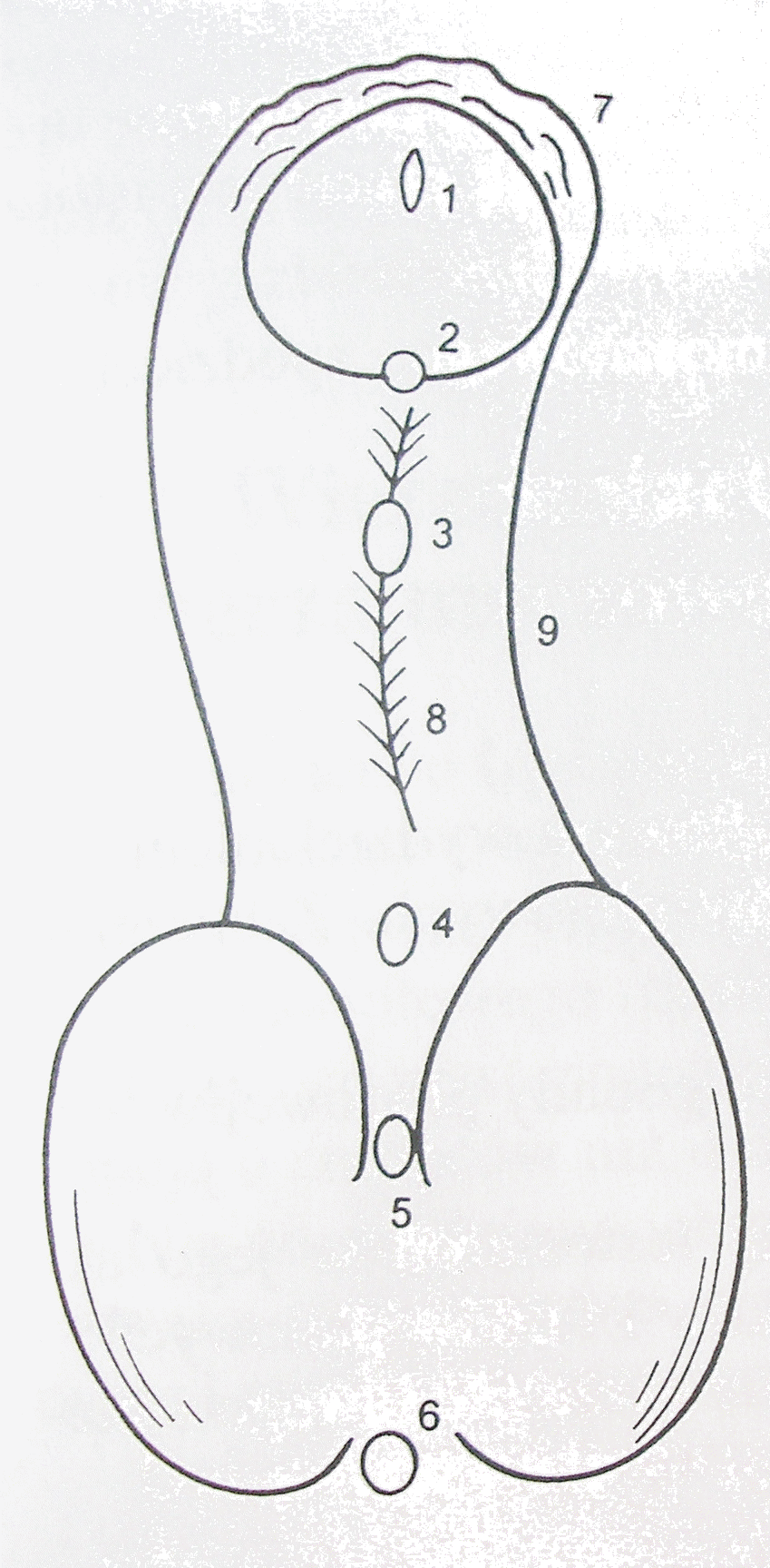 1 – нормальное расположение наружного отверстия уретры на головке полового члена. Локализация наружного отверстия уретры при гипоспадии: 2 – венечная гипоспадия, 3 – гипоспадия средней трети полового члена; 4 – члено-мошоночная гипоспадия; 5 – мошоночная гипоспадия; 6 – промежностная гипоспадия; 8 – хорда; 9 – искривление полового члена